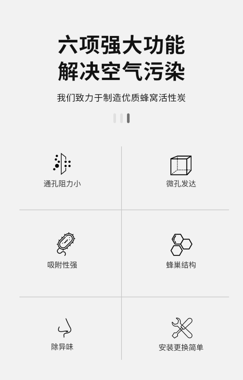 二、防油霧。蜂窩活性炭是微孔發(fā)達(dá)物質(zhì),微孔對(duì)于甲醛、苯、二甲苯等小分子粒徑的有很好,而對(duì)于油霧等大分子類物質(zhì),蜂窩活性炭的吸附能力就會(huì)減弱,油脂甚至?xí)氯涓C活性炭微孔。