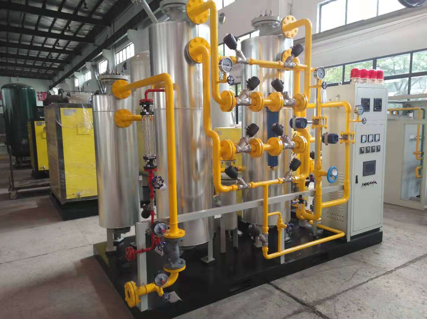 空氣壓縮機(jī)壓縮后,除塵、除油、干燥后,進(jìn)入空氣儲罐,通過空氣進(jìn)氣閥、左吸氣閥進(jìn)入左吸附塔,塔壓升高,壓縮空氣中的氧分子被碳分子篩吸附,未吸附氮通過吸附床,通過左吸氣閥、氮氣閥進(jìn)入氮氣儲罐,稱為左吸,持續(xù)幾十秒。食品小型制氮機(jī)。左吸過程結(jié)束后,左吸附塔與右吸附塔通過上下均壓閥連接,使兩塔壓力平衡。該過程稱為均壓,持續(xù)時間為2~3秒。均壓后,壓縮空氣通過空氣進(jìn)氣閥和右吸進(jìn)氣閥進(jìn)入右吸附塔。壓縮空氣中的氧分子被碳分子篩吸附,富氮通過右吸出氣閥和氮氣產(chǎn)氣閥進(jìn)入氮氣儲罐。這個過程叫右吸,持續(xù)幾十秒。同時,左吸附塔中碳分子篩吸附的氧氣通過左排氣閥降壓釋放回大氣中,稱為解吸。相反,左塔吸附時,右塔也在解吸。為了使分子篩中降壓釋放的氧氣完全排放到大氣中,氮氣通過常開的反吹閥吹走吸附塔,將吸附塔中的氧氣吹出吸附塔。這個過程被稱為反吹,它是同時進(jìn)行的。食品級制氮機(jī)。右吸后,進(jìn)入均壓過程,然后切換到左吸過程,一直循環(huán)。