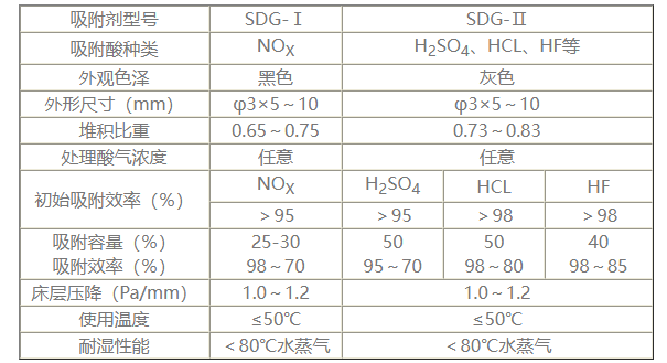 酸氣吸附效果較好的產品主要集中在SDG酸氣吸附劑和氧化鐵脫硫劑兩類,具體選擇根據實際處理的酸氣類型,使用場景及工藝要求綜合考慮。SDG酸氣吸附劑是當前應用較廣的酸性氣體凈化材料,具有吸附效率高,適用性廣,對環(huán)境友好,無二次污染和分型設計的特點。SDG酸氣吸附劑分為1型和二型,分別對硝酸霧和硫酸,鹽酸等氣體有較好的處理效果。